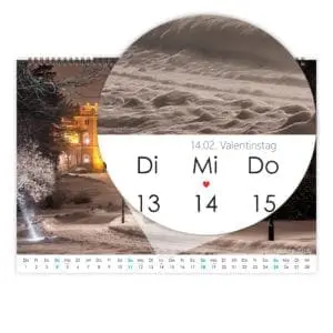 Kommen wir nun zum Kalender selbst. Im Kalendarium verstecken sich viele Details. Neben den üblichen Dingen wie farbig hervorgehobene Feiertage – mit Zuordnung der betroffenen Bundesländer – und farbigen Sonntagen, finden sich wichtige Infos im gesamten Kalender. Dies bieten nicht viele Kalender. So zeigen kleine passende Symbole den Beginn der Jahreszeiten, die Zeitumstellung auf Sommer- bzw. Winterzeit oder den Valentinstag – der mit einem kleinen roten Herz gekennzeichnet ist – an.
