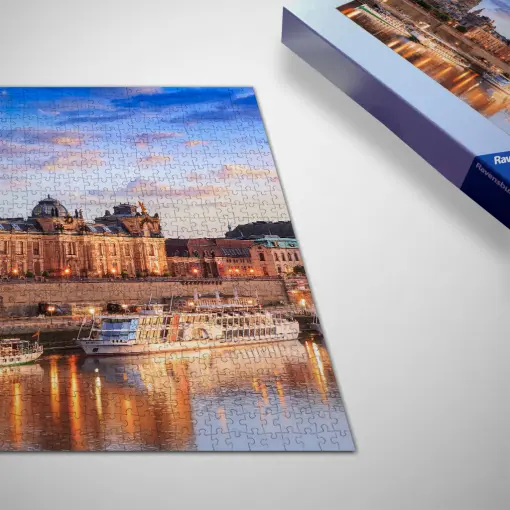 Ein warmer Sommerabend umhüllt das Dresdner Elbufer, während die goldene Stunde ihre letzten, schimmernden Strahlen über die Szenerie ausbreitet. Der Blick erstreckt sich über die sanft fließende Elbe hinweg, hinein in das historische Herz der Dresdner Altstadt. In der Ferne erheben sich ikonische Wahrzeichen: die Frauenkirche mit ihrer prachtvollen Kuppel, die markante Silhouette der “Zitronenpresse” – der Kunstakademie – und die eleganten Formen der Hochschule für Bildende Künste, die zusammen ein malerisches Ensemble bilden. Die Sonne hat gerade den Horizont geküsst und sich für den Tag verabschiedet, während die Stadtbeleuchtung sanft erwacht und ein warmes Licht auf die Architektur und die Wasserfläche der Elbe wirft. Die Atmosphäre ist friedlich und einladend, ein perfekter Sommerabend, der zum Verweilen und Bewundern einlädt.