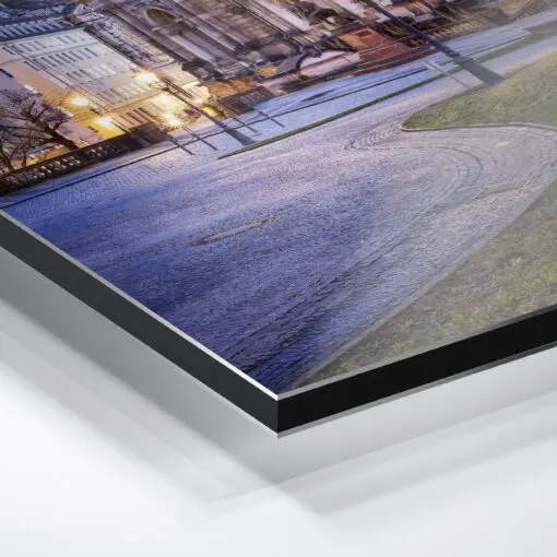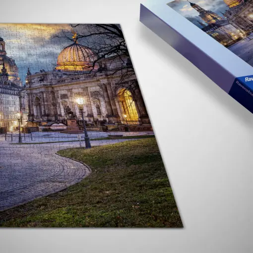 Das Bild präsentiert eine stimmungsvolle Szene aus dem Brühlschen Garten in Dresden am frühen Abend. Der Blick wird hinüber zur markanten Silhouette der Frauenkirche und dem unverwechselbaren Umriss der Zitronenpresse gelenkt. Nach dem Sonnenuntergang sind der Himmel und die Wolken von den letzten Tageslichtstrahlen in ein dramatisches Spiel aus Blau und Orange getaucht. Das stürmische Wetter hat die Wolken aufgewühlt, was der Szene eine dynamische und lebendige Atmosphäre verleiht. Diese Kontraste aus Farbe und Bewegung erzeugen ein fesselndes Naturschauspiel, das die historische Architektur Dresdens in ein besonderes Licht rückt und eine einzigartige Stimmung einfängt.