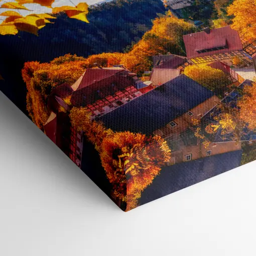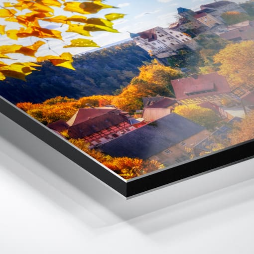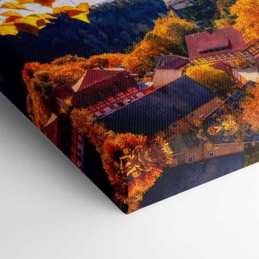 An einem milden Herbsttag taucht die Sonne die Sächsische Schweiz in ein warmes, goldenes Licht. Durch das dichte, bunt gefärbte Laub der Bäume – in Schattierungen von leuchtendem Gelb, tiefem Orange und sattem Rot – fällt ihr Strahl wie ein sanfter Schleier auf die Landschaft. Der Blick gleitet hindurch, über die sanften Hügel hinweg, bis er im Tal auf das malerische Städtchen Hohnstein trifft.