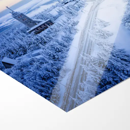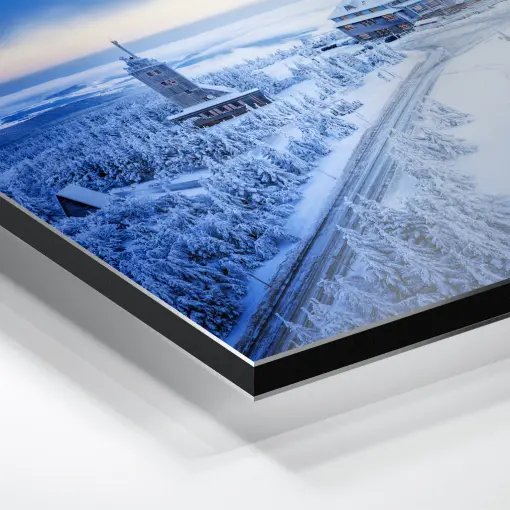 Ein frostiger Wintermorgen bei -10 °C auf dem höchsten Gipfel Sachsens: Der Fichtelberg liegt in tiefem, makellosem Schnee versunken, während das Fichtelberghaus wie ein leuchtendes Refugium inmitten der Kälte thront. Die warmen Lichter hinter den Fenstern kontrastieren zauberhaft mit der eisigen Bläue der Umgebung und den pastellfarbenen Streifen des heraufdämmernden Himmels – ein zartes Spiel aus Apricot, Rosa und erstem Gold.