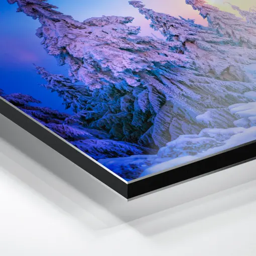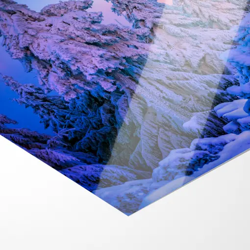 Das Bild fängt die eisige Stille perfekt ein: tiefblaue Dämmerung, funkelnder Schnee und der leuchtende Hof um den Mond – pure Wintermystik.