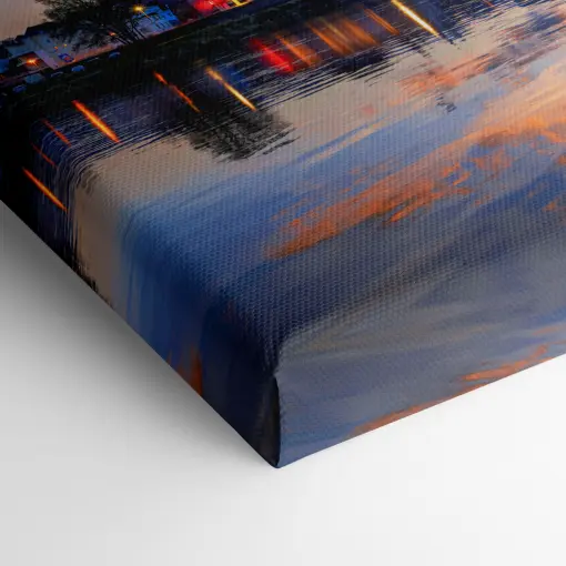 Besonders magisch wirkt die Kombination aus natürlichem Abendlicht und der bereits eingeschalteten warmen Beleuchtung der Burg und der malerischen Altstadt von Meißen. Die Lichter der Häuser und Straßenlaternen malen lange, glitzernde Reflexionen auf die Wasseroberfläche, die das gesamte Ensemble wie ein perfektes Spiegelbild verdoppelt.