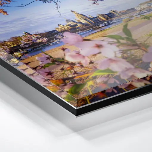 Früh am Morgen, wenn die ersten goldenen Strahlen der aufgehenden Sonne die Elbe und die barocke Skyline von Dresden sanft streicheln, öffnet sich ein zauberhafter Blick vom Königsufer aus. Im Vordergrund rahmt ein üppig blühender Kirschbaum das Bild ein – zarte rosa-weiße Blüten hängen schwer an den Ästen und lassen die Szene wie aus einem Traum wirken.