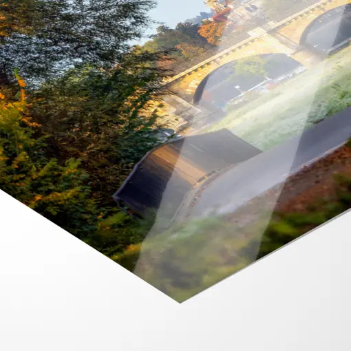 Die herbstliche Elbe liegt noch im sanften Morgennebel, als die goldene Kuppel der Frauenkirche über der Stadt erstrahlt. Im Vordergrund überspannt die elegante Albertbrücke mit ihren Sandsteinbögen den Fluss, gerahmt von leuchtend gelben Bäumen. Ein taufrischer Uferpfad, bunte Blätter im Gras – Dresden zeigt sich im warmen Oktoberlicht von seiner allerschönsten Seite.