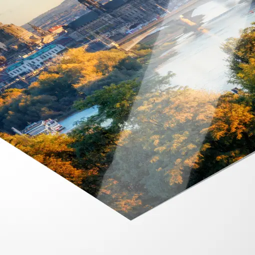 Von der Drohne aus, hoch über der Elbe, breitet sich Dresdens unvergleichliche Skyline im warmen Abendlicht aus: Die goldene Kuppel der Frauenkirche leuchtet als Herzstück, flankiert vom klassizistischen Ständehaus und der mächtigen Hofkirche. Dahinter ragen Rathausturm, Hausmannsturm und der Turm der Kreuzkirche in den zart violett-orangefarbenen Himmel. Im Vordergrund thront die elegante Semperoper, während die Marienbrücke wie ein filigranes Band die Elbe überspannt. Herbstliche Bäume in flammendem Gold säumen das Ufer – ein atemberaubendes Panorama, in dem die Elbflorenz im sanften Glanz der blauen Stunde Geschichte und Schönheit vereint.