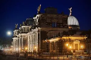 Trotzdem machten wir einige Fotos und liefen dann zum Terassenufer um dort den Mond etwas besser in Szene zu setzen. Am Terassenufer setzten wir uns auf eine der Bänke und machten einige Fotos von der Kunstakademie sowie dem Vollmond. durch die lange Belichtungszeit mussten wir den Mond nachträglich abdunkeln damit man in diesem noch etwas Struktur erkennen kann.