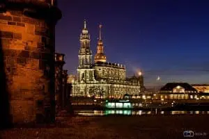 Am Abend an dem das Glaskugelbild entstand, wurde auch dieses Foto geschossen. Der Fotostandpunkte befindet sich nur wenige Meter neben dem des Glaskugelbildes. An diesem Abend ging der Mond bereits am frühen Abend über den Dächern Dresdens unter. Das Bild zeigt die Dresdner Hofkirche neben der sich die Augustusbrücke über die Elbe spannt. Das Foto wurde aus einer Belichtungsreihe zusammengestellt damit die Brücke links nicht allzu doll in der Dunkelheit verschwindet.