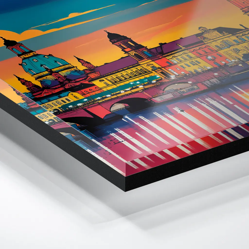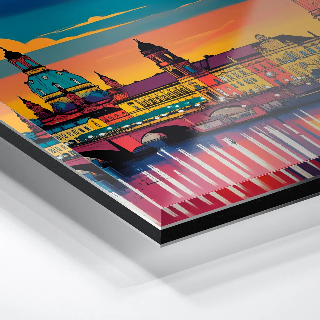 Das Foto wird im UV-Direktdruckverfahren auf eine glänzende Acrylplatte gedruckt. Die Kombination aus kristallklarem Acrylglas und den lichtechten UV-Tinten sorgt für eine langlebige und detailscharfe Wiedergabe der Bilder. Das Bild wird bei dieser Variante durch eine rückseitige 3 mm starke schwarze Forexplatte verstärkt. Es ist durch den Direktdruck und die verwendeten Materialien günstiger, wirkt aber auch sehr hochwertig.