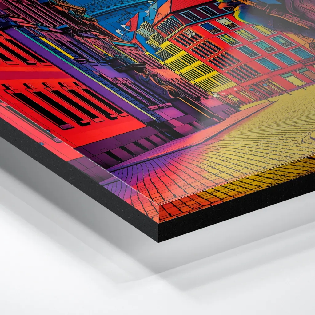 Das Foto wird im UV-Direktdruckverfahren auf eine glänzende Acrylplatte gedruckt. Die Kombination aus kristallklarem Acrylglas und den lichtechten UV-Tinten sorgt für eine langlebige und detailscharfe Wiedergabe der Bilder. Das Bild wird bei dieser Variante durch eine rückseitige 3 mm starke schwarze Forexplatte verstärkt. Es ist durch den Direktdruck und die verwendeten Materialien günstiger, wirkt aber auch sehr hochwertig.