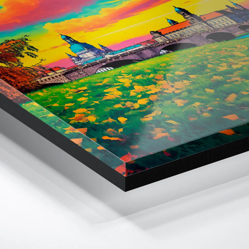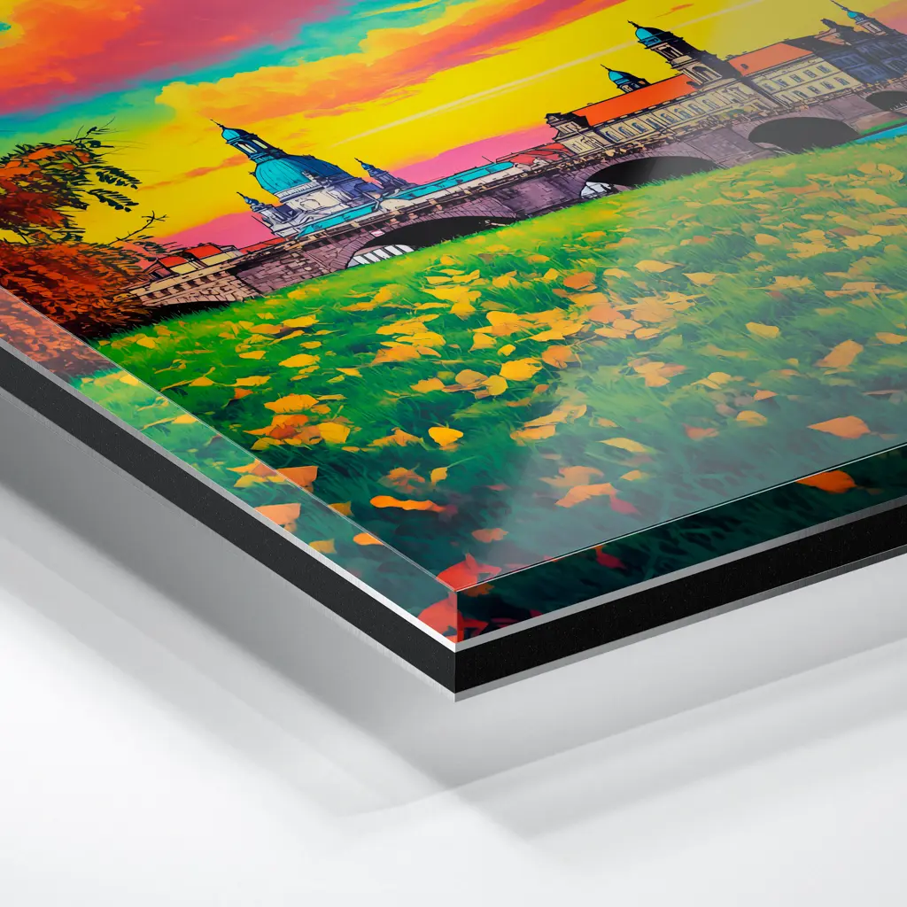Das Foto wird im UV-Direktdruckverfahren auf eine glänzende Acrylplatte gedruckt. Die Kombination aus kristallklarem Acrylglas und den lichtechten UV-Tinten sorgt für eine langlebige und detailscharfe Wiedergabe der Bilder. Das Bild wird bei dieser Variante durch eine rückseitige 3 mm starke schwarze Forexplatte verstärkt. Es ist durch den Direktdruck und die verwendeten Materialien günstiger, wirkt aber auch sehr hochwertig.