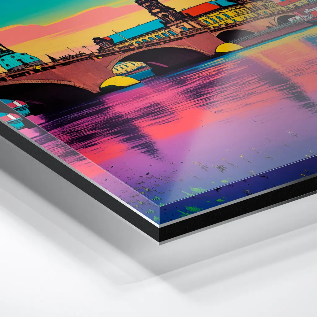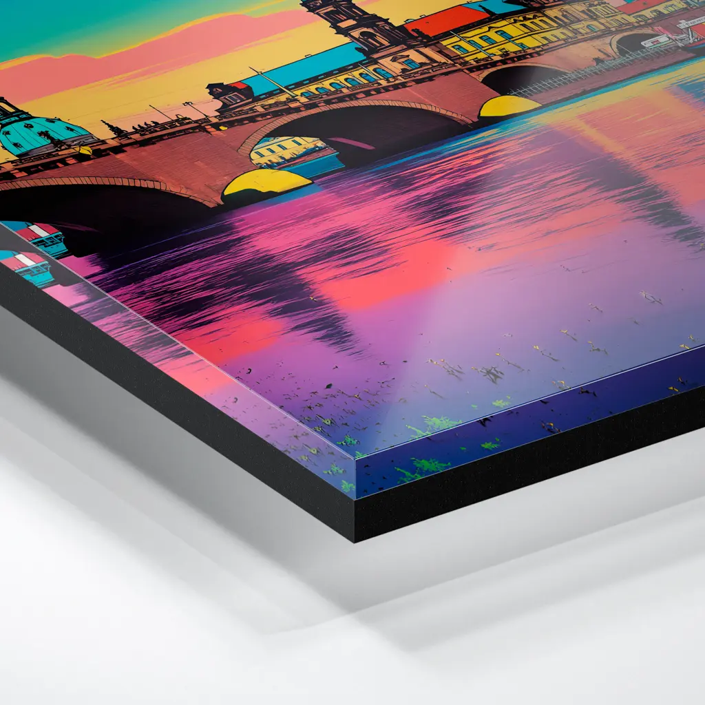 Das Foto wird im UV-Direktdruckverfahren auf eine glänzende Acrylplatte gedruckt. Die Kombination aus kristallklarem Acrylglas und den lichtechten UV-Tinten sorgt für eine langlebige und detailscharfe Wiedergabe der Bilder. Das Bild wird bei dieser Variante durch eine rückseitige 3 mm starke schwarze Forexplatte verstärkt. Es ist durch den Direktdruck und die verwendeten Materialien günstiger, wirkt aber auch sehr hochwertig.