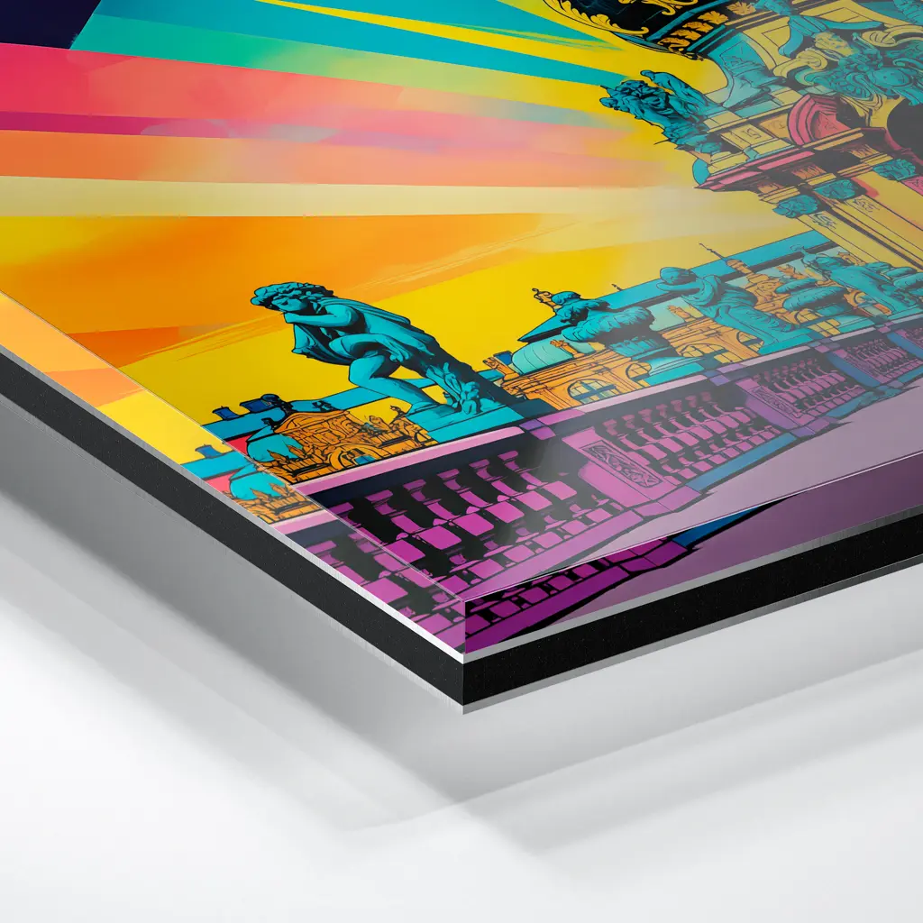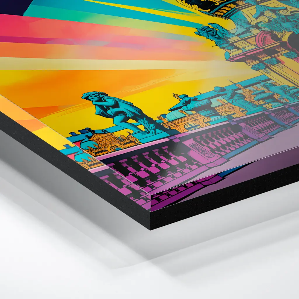 Das Foto wird im UV-Direktdruckverfahren auf eine glänzende Acrylplatte gedruckt. Die Kombination aus kristallklarem Acrylglas und den lichtechten UV-Tinten sorgt für eine langlebige und detailscharfe Wiedergabe der Bilder. Das Bild wird bei dieser Variante durch eine rückseitige 3 mm starke schwarze Forexplatte verstärkt. Es ist durch den Direktdruck und die verwendeten Materialien günstiger, wirkt aber auch sehr hochwertig.