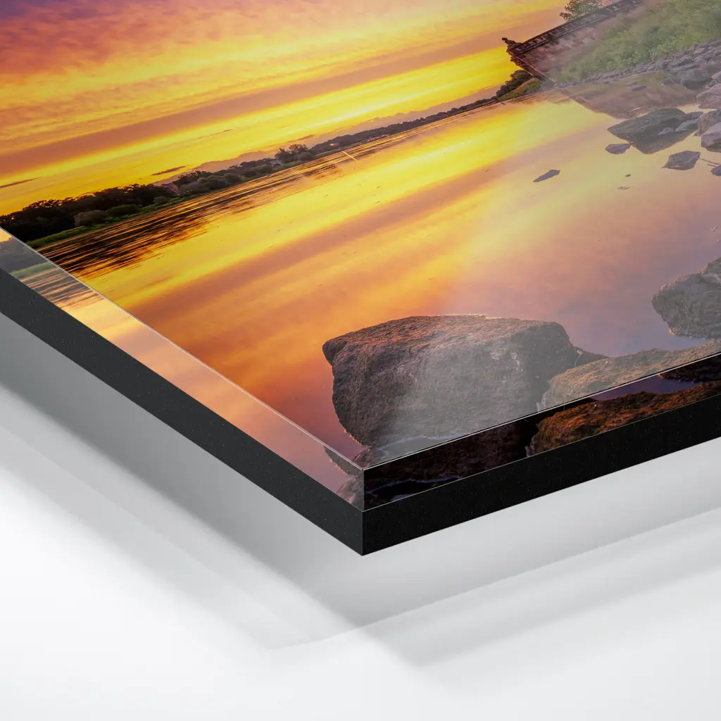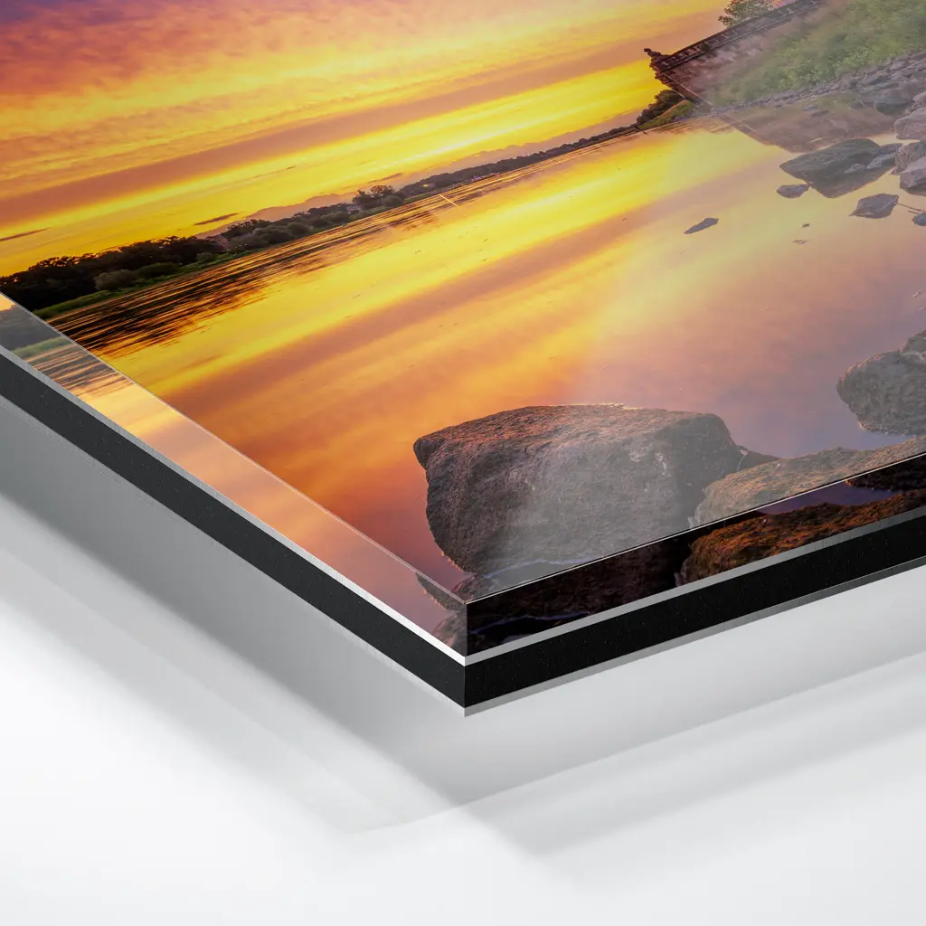 Das Foto wird im UV-Direktdruckverfahren auf eine glänzende Acrylplatte gedruckt. Die Kombination aus kristallklarem Acrylglas und den lichtechten UV-Tinten sorgt für eine langlebige und detailscharfe Wiedergabe der Bilder. Das Bild wird bei dieser Variante durch eine rückseitige 3 mm starke schwarze Forexplatte verstärkt. Es ist durch den Direktdruck und die verwendeten Materialien günstiger, wirkt aber auch sehr hochwertig.