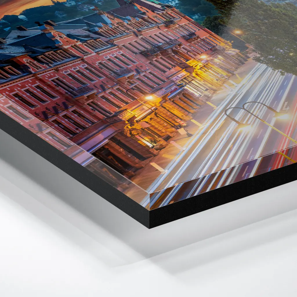 Das Foto wird im UV-Direktdruckverfahren auf eine glänzende Acrylplatte gedruckt. Die Kombination aus kristallklarem Acrylglas und den lichtechten UV-Tinten sorgt für eine langlebige und detailscharfe Wiedergabe der Bilder. Das Bild wird bei dieser Variante durch eine rückseitige 3 mm starke schwarze Forexplatte verstärkt. Es ist durch den Direktdruck und die verwendeten Materialien günstiger, wirkt aber auch sehr hochwertig.