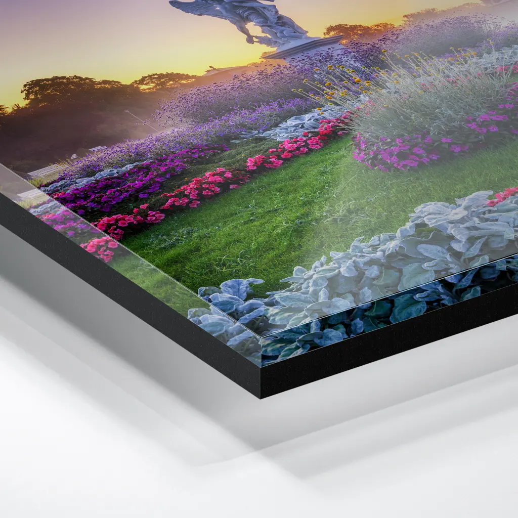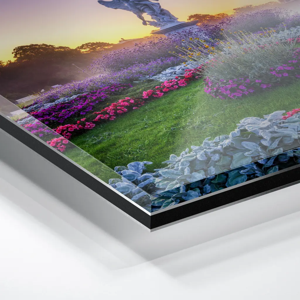 Das Foto wird im UV-Direktdruckverfahren auf eine glänzende Acrylplatte gedruckt. Die Kombination aus kristallklarem Acrylglas und den lichtechten UV-Tinten sorgt für eine langlebige und detailscharfe Wiedergabe der Bilder. Das Bild wird bei dieser Variante durch eine rückseitige 3 mm starke schwarze Forexplatte verstärkt. Es ist durch den Direktdruck und die verwendeten Materialien günstiger, wirkt aber auch sehr hochwertig.