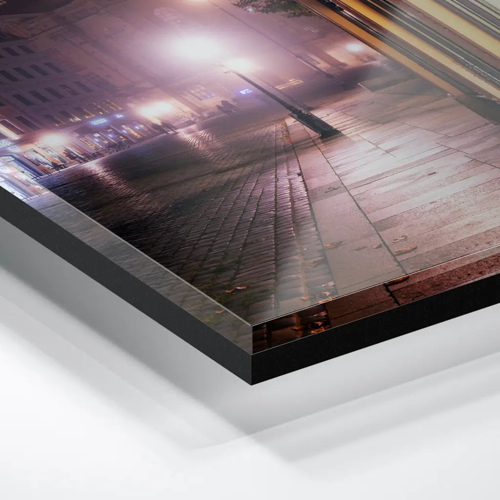 Das Foto wird im UV-Direktdruckverfahren auf eine glänzende Acrylplatte gedruckt. Die Kombination aus kristallklarem Acrylglas und den lichtechten UV-Tinten sorgt für eine langlebige und detailscharfe Wiedergabe der Bilder. Das Bild wird bei dieser Variante durch eine rückseitige 3 mm starke schwarze Forexplatte verstärkt. Es ist durch den Direktdruck und die verwendeten Materialien günstiger, wirkt aber auch sehr hochwertig.