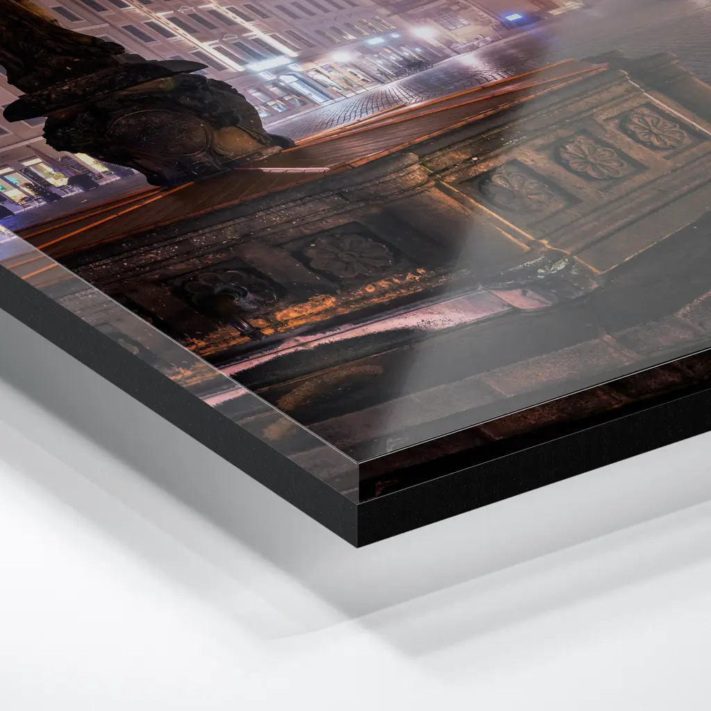 Das Foto wird im UV-Direktdruckverfahren auf eine glänzende Acrylplatte gedruckt. Die Kombination aus kristallklarem Acrylglas und den lichtechten UV-Tinten sorgt für eine langlebige und detailscharfe Wiedergabe der Bilder. Das Bild wird bei dieser Variante durch eine rückseitige 3 mm starke schwarze Forexplatte verstärkt. Es ist durch den Direktdruck und die verwendeten Materialien günstiger, wirkt aber auch sehr hochwertig.