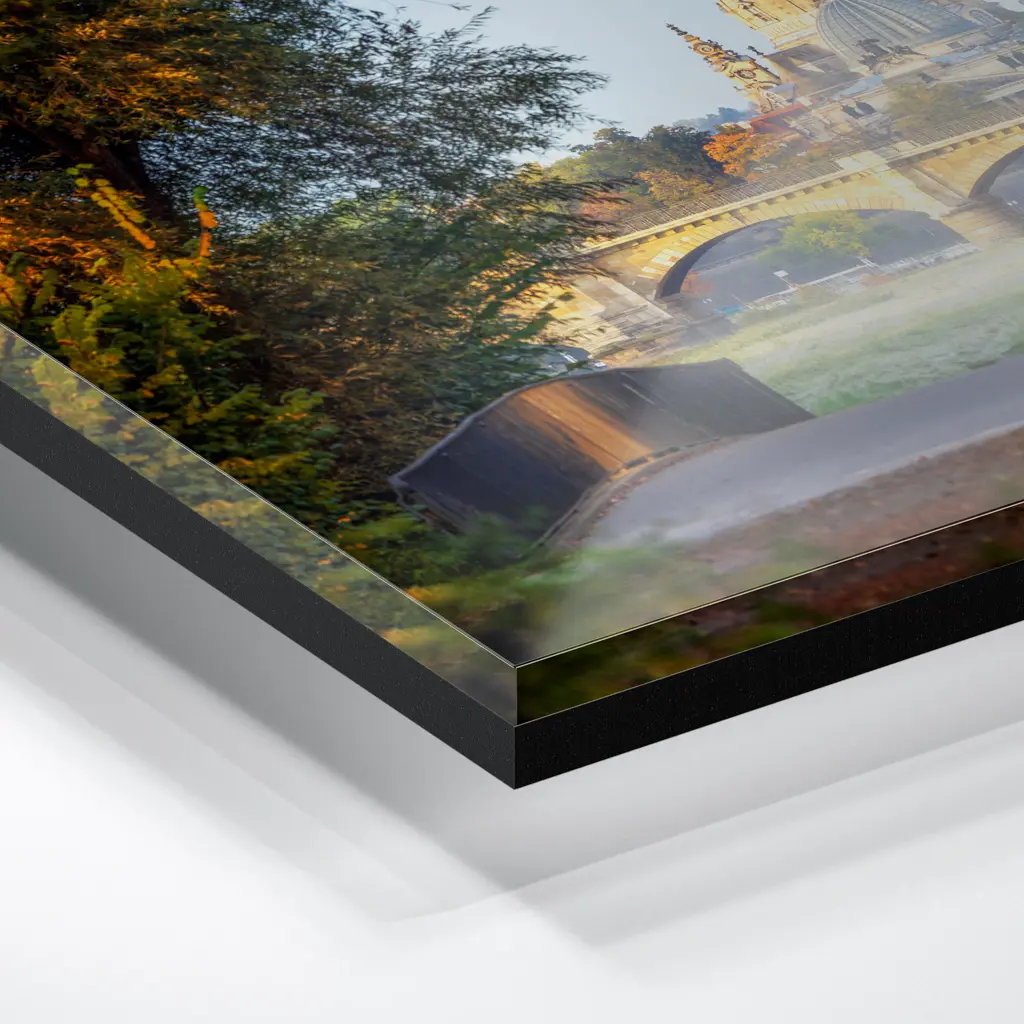 Das Foto wird im UV-Direktdruckverfahren auf eine glänzende Acrylplatte gedruckt. Die Kombination aus kristallklarem Acrylglas und den lichtechten UV-Tinten sorgt für eine langlebige und detailscharfe Wiedergabe der Bilder. Das Bild wird bei dieser Variante durch eine rückseitige 3 mm starke schwarze Forexplatte verstärkt. Es ist durch den Direktdruck und die verwendeten Materialien günstiger, wirkt aber auch sehr hochwertig.