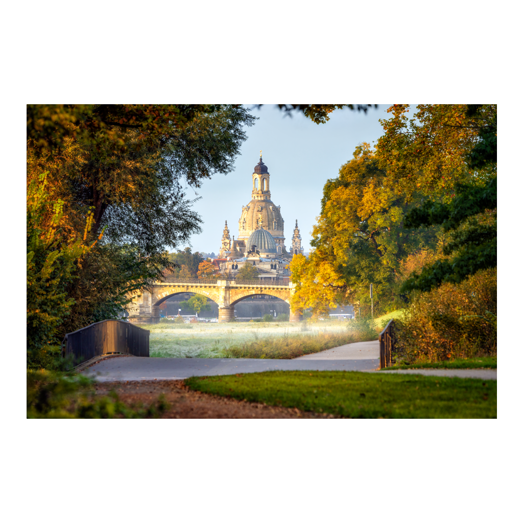 Die herbstliche Elbe liegt noch im sanften Morgennebel, als die goldene Kuppel der Frauenkirche über der Stadt erstrahlt. Im Vordergrund überspannt die elegante Albertbrücke mit ihren Sandsteinbögen den Fluss, gerahmt von leuchtend gelben Bäumen. Ein taufrischer Uferpfad, bunte Blätter im Gras – Dresden zeigt sich im warmen Oktoberlicht von seiner allerschönsten Seite.