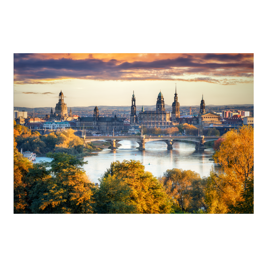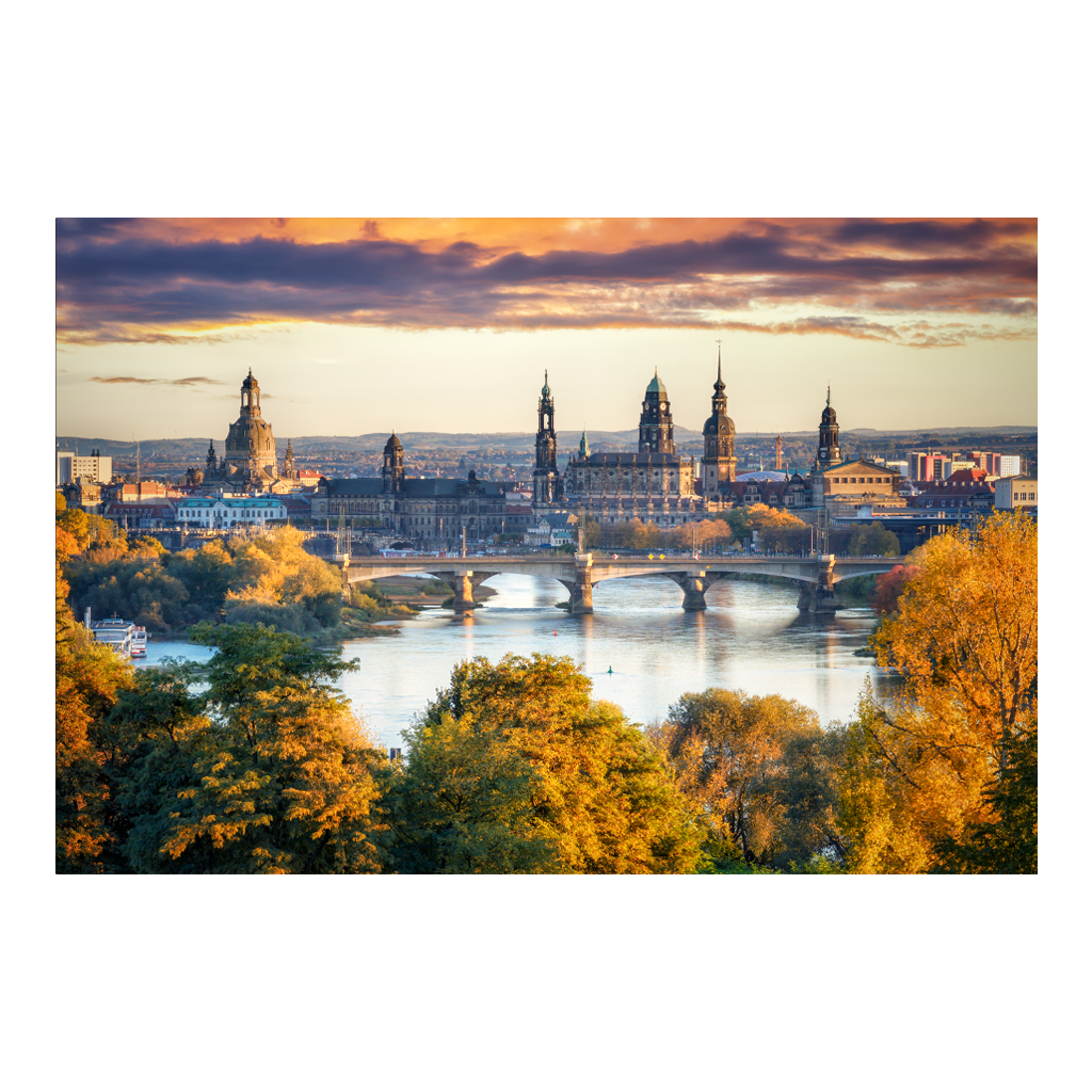 Von der Drohne aus, hoch über der Elbe, breitet sich Dresdens unvergleichliche Skyline im warmen Abendlicht aus: Die goldene Kuppel der Frauenkirche leuchtet als Herzstück, flankiert vom klassizistischen Ständehaus und der mächtigen Hofkirche. Dahinter ragen Rathausturm, Hausmannsturm und der Turm der Kreuzkirche in den zart violett-orangefarbenen Himmel. Im Vordergrund thront die elegante Semperoper, während die Marienbrücke wie ein filigranes Band die Elbe überspannt. Herbstliche Bäume in flammendem Gold säumen das Ufer – ein atemberaubendes Panorama, in dem die Elbflorenz im sanften Glanz der blauen Stunde Geschichte und Schönheit vereint.