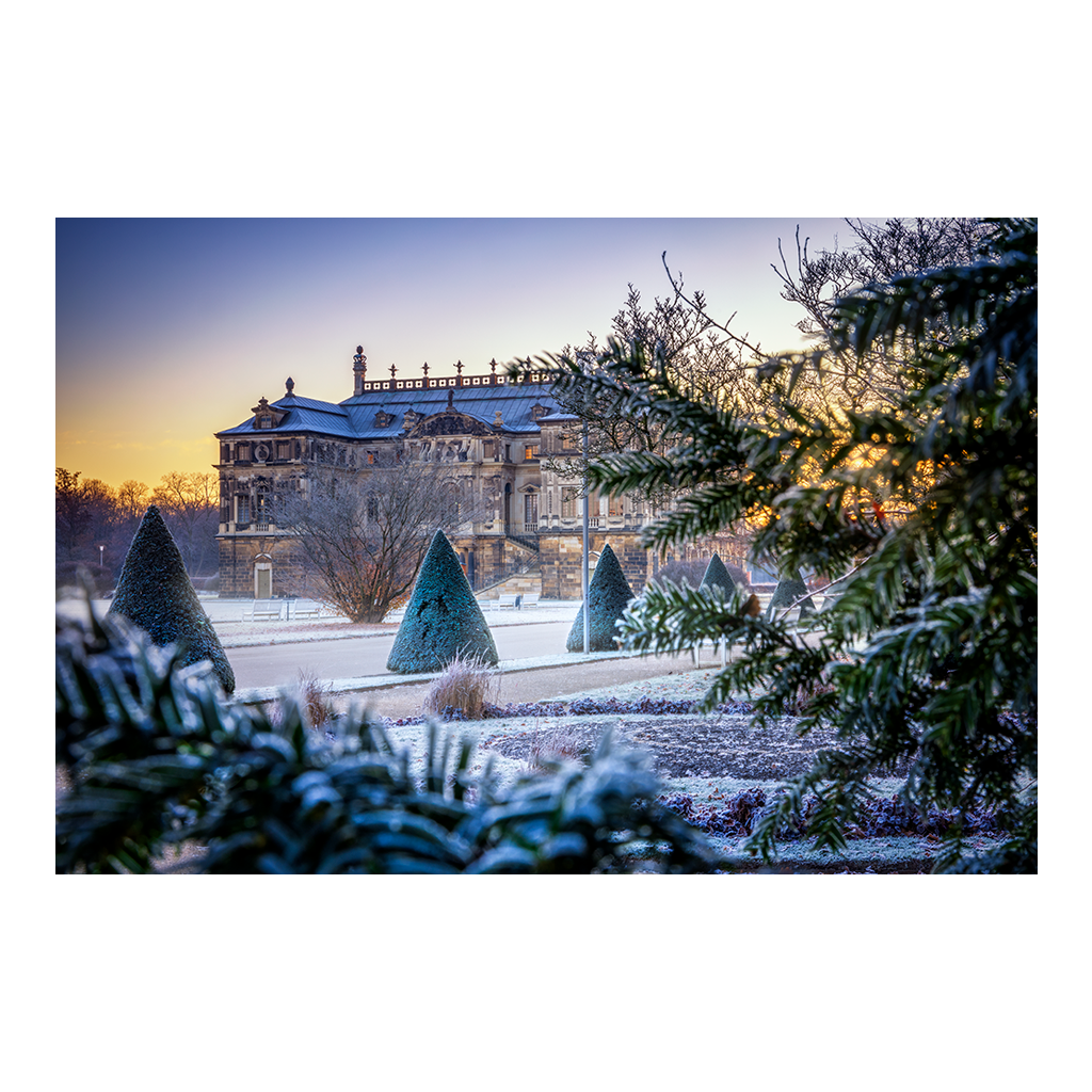 Im Herzen des Großen Gartens in Dresden erhebt sich das majestätische Palais, ein barockes Juwel aus vergoldeten Fassaden und eleganten Arkaden, das in der Kälte eines eisigen Wintermorgens bei minus neun Grad zu einem erfrorenen Traum erstarrt ist. Der Sonnenaufgang taucht den Horizont in ein zartes Rosa und Orange, wirft lange Schatten über den Reif bedeckten Rasen und lässt die Raureif-Kristalle auf den Ästen wie Diamantsplitter funkeln. Im Vordergrund rahmen vereiste Tannen die Szene ein, ihre Nadeln und Blätter in einem hauchdünnen Mantel aus Frost gefangen, während der Pfad zum Palais in einem sanften Nebel aus Schnee und Stille führt. Es ist ein Moment der atemberaubenden Stille, in dem die Kälte die Welt verzaubert und das Palais wie ein schlafender Riese im goldenen Licht erwacht.