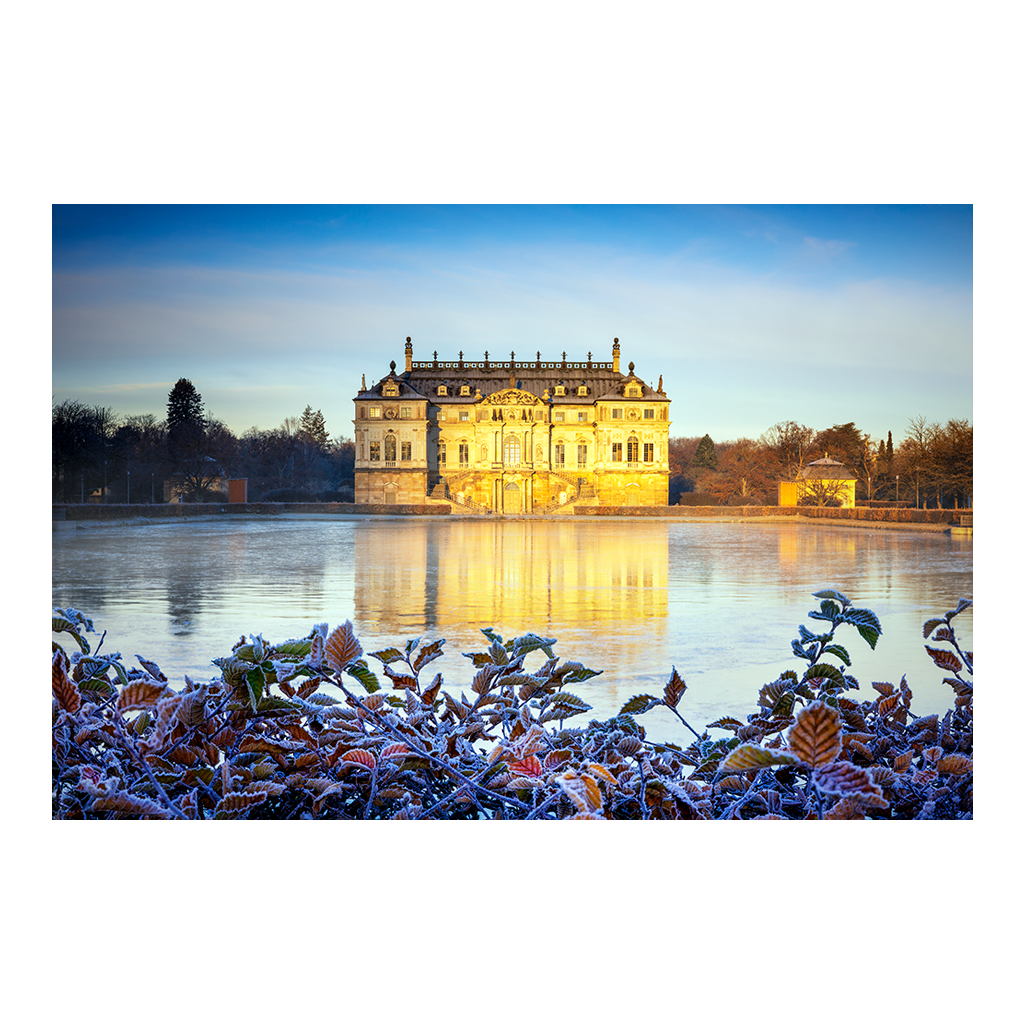Ein eisiger Wintermorgen bei minus neun Grad im Großen Garten Dresden: Der Palaissteich liegt spiegelglatt und tiefgefroren da, eine makellose Ebene aus Eis, die den Himmel und das barocke Palais in perfekter Symmetrie verdoppelt. Die ersten Sonnenstrahlen des jungen Tages brechen über den Horizont und tauchen die elegante Fassade des Palais in warmes, goldenes Licht, während der Raureif auf den akkurat geschnittenen Hecken wie Millionen winziger Diamanten funkelt. Die barocken Formen der Gartenarchitektur wirken wie aus Zuckerglasur, still und verzaubert in der kristallklaren Kälte. Ein magischer Moment, in dem die Sonne die eisige Welt in flüssiges Gold verwandelt und das Palais wie ein Märchenschloss über dem gefrorenen Teich thront.