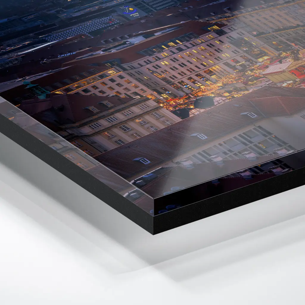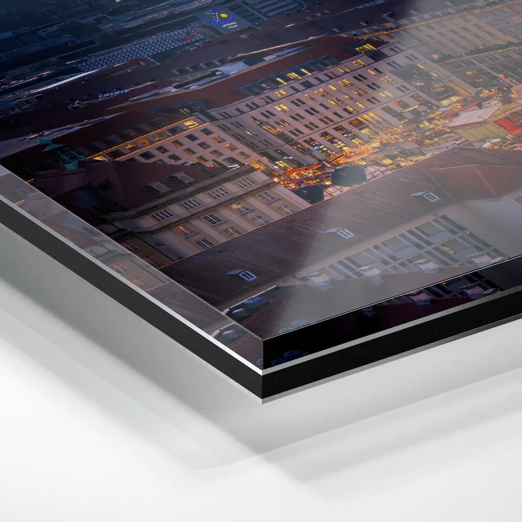 Das Foto wird im UV-Direktdruckverfahren auf eine glänzende Acrylplatte gedruckt. Die Kombination aus kristallklarem Acrylglas und den lichtechten UV-Tinten sorgt für eine langlebige und detailscharfe Wiedergabe der Bilder. Das Bild wird bei dieser Variante durch eine rückseitige 3 mm starke schwarze Forexplatte verstärkt. Es ist durch den Direktdruck und die verwendeten Materialien günstiger, wirkt aber auch sehr hochwertig.