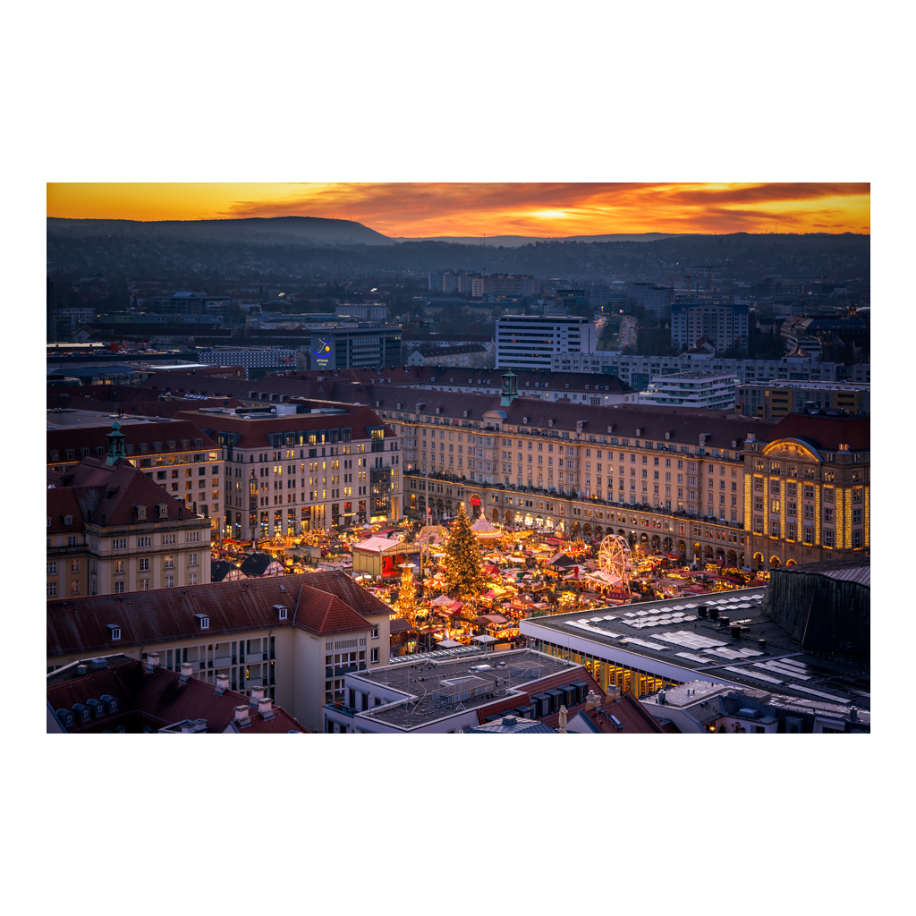 Von der Kuppel der Frauenkirche aus breitet sich der Dresdner Striezelmarkt in der magischen Blauen Stunde wie ein leuchtendes Juwel aus. Die Sonne ist gerade untergegangen und taucht den Himmel in ein intensives, glutrotes Abendrot, das sich mit den ersten tiefblauen Schattierungen der Dämmerung mischt. Wolkenstreifen glühen in Orange und Pink, während die Stadtlichter allmählich erwachen.