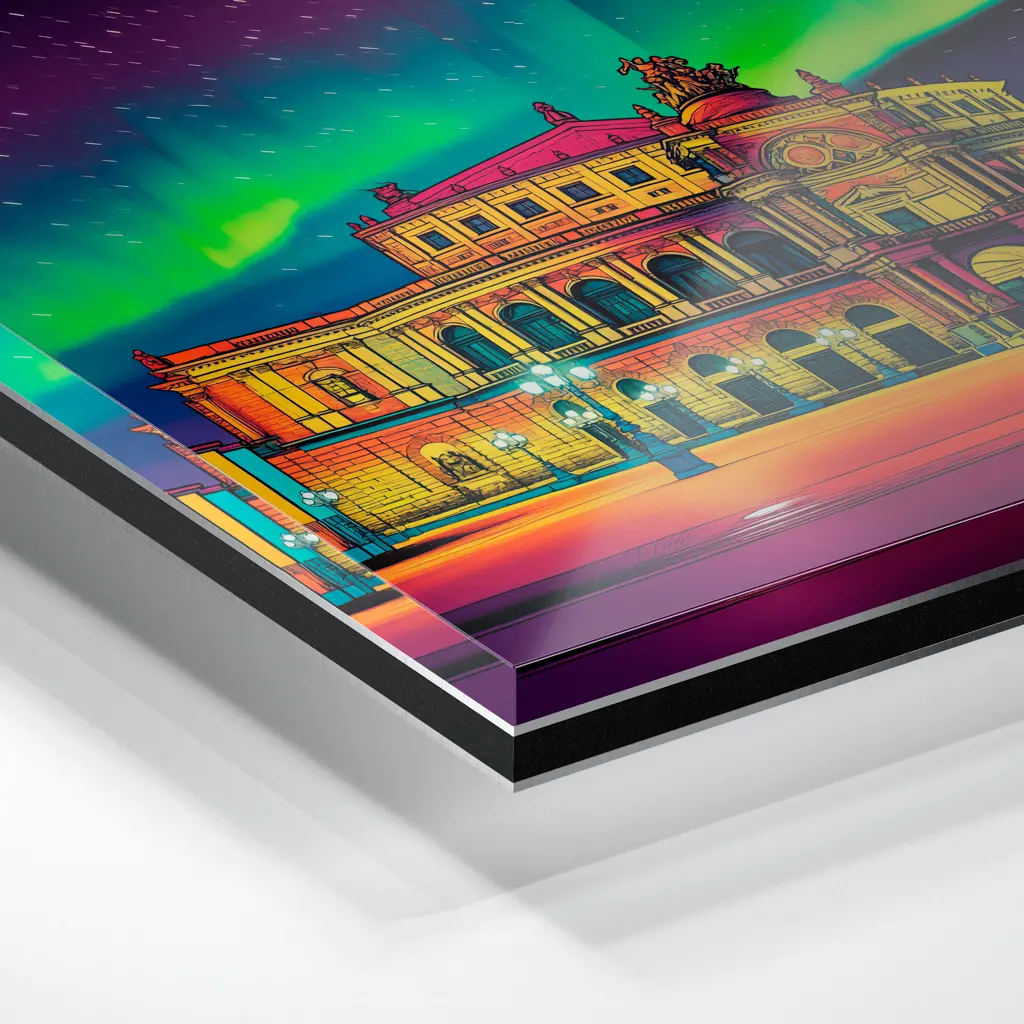 Das Foto wird im UV-Direktdruckverfahren auf eine glänzende Acrylplatte gedruckt. Die Kombination aus kristallklarem Acrylglas und den lichtechten UV-Tinten sorgt für eine langlebige und detailscharfe Wiedergabe der Bilder. Das Bild wird bei dieser Variante durch eine rückseitige 3 mm starke schwarze Forexplatte verstärkt. Es ist durch den Direktdruck und die verwendeten Materialien günstiger, wirkt aber auch sehr hochwertig.