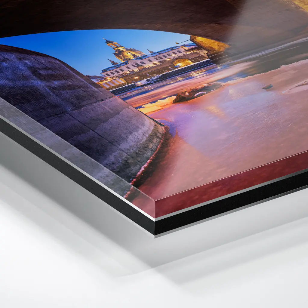 Das Foto wird im UV-Direktdruckverfahren auf eine glänzende Acrylplatte gedruckt. Die Kombination aus kristallklarem Acrylglas und den lichtechten UV-Tinten sorgt für eine langlebige und detailscharfe Wiedergabe der Bilder. Das Bild wird bei dieser Variante durch eine rückseitige 3 mm starke schwarze Forexplatte verstärkt. Es ist durch den Direktdruck und die verwendeten Materialien günstiger, wirkt aber auch sehr hochwertig.