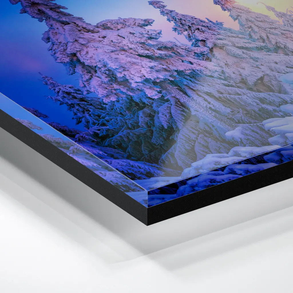 Das Foto wird im UV-Direktdruckverfahren auf eine glänzende Acrylplatte gedruckt. Die Kombination aus kristallklarem Acrylglas und den lichtechten UV-Tinten sorgt für eine langlebige und detailscharfe Wiedergabe der Bilder. Das Bild wird bei dieser Variante durch eine rückseitige 3 mm starke schwarze Forexplatte verstärkt. Es ist durch den Direktdruck und die verwendeten Materialien günstiger, wirkt aber auch sehr hochwertig.