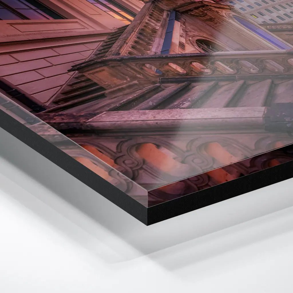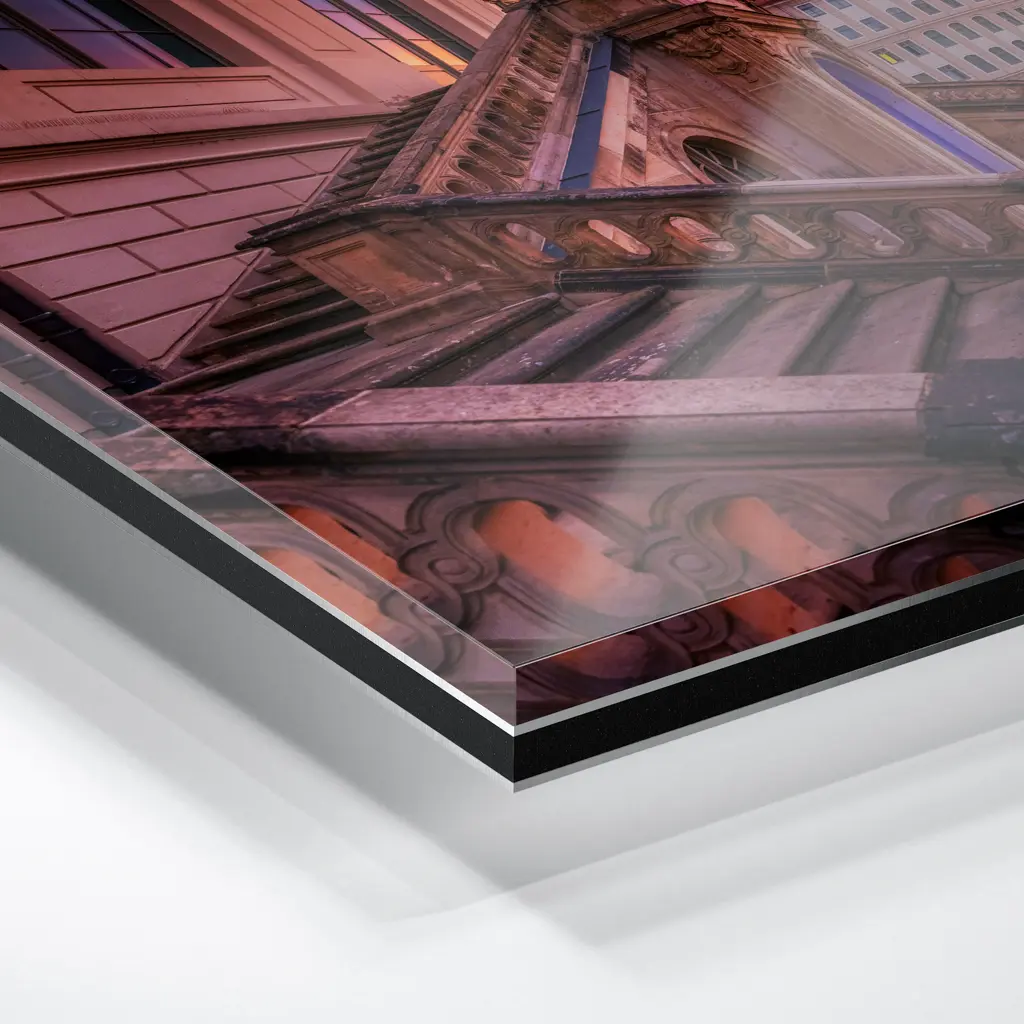Das Foto wird im UV-Direktdruckverfahren auf eine glänzende Acrylplatte gedruckt. Die Kombination aus kristallklarem Acrylglas und den lichtechten UV-Tinten sorgt für eine langlebige und detailscharfe Wiedergabe der Bilder. Das Bild wird bei dieser Variante durch eine rückseitige 3 mm starke schwarze Forexplatte verstärkt. Es ist durch den Direktdruck und die verwendeten Materialien günstiger, wirkt aber auch sehr hochwertig.