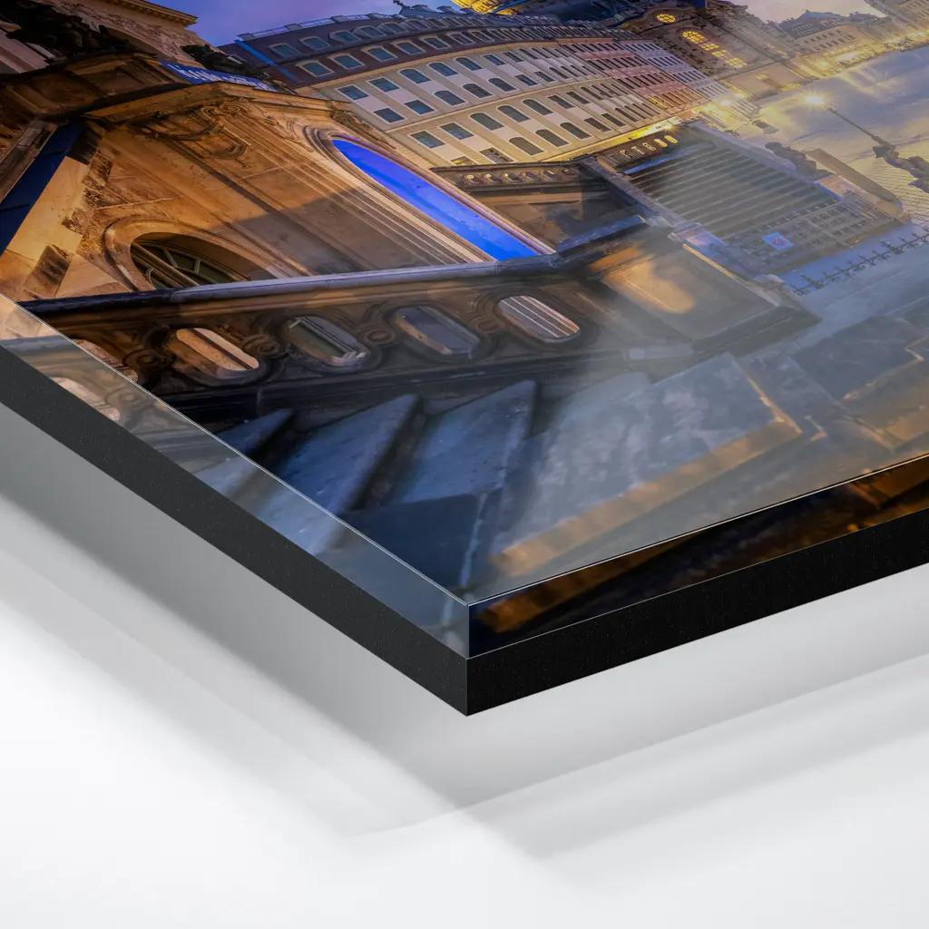 In der zarten Blauen Stunde, kurz vor dem ersten Gold des Morgens, liegt der Dresdner Neumarkt in stiller, fast überirdischer Ruhe. Von den geschwungenen Treppen des Verkehrsmuseums blickt man hinab auf das weite, leergefegte Pflaster des Platzes, das im kühlen Blauviolett des frühen Himmels sanft schimmert.