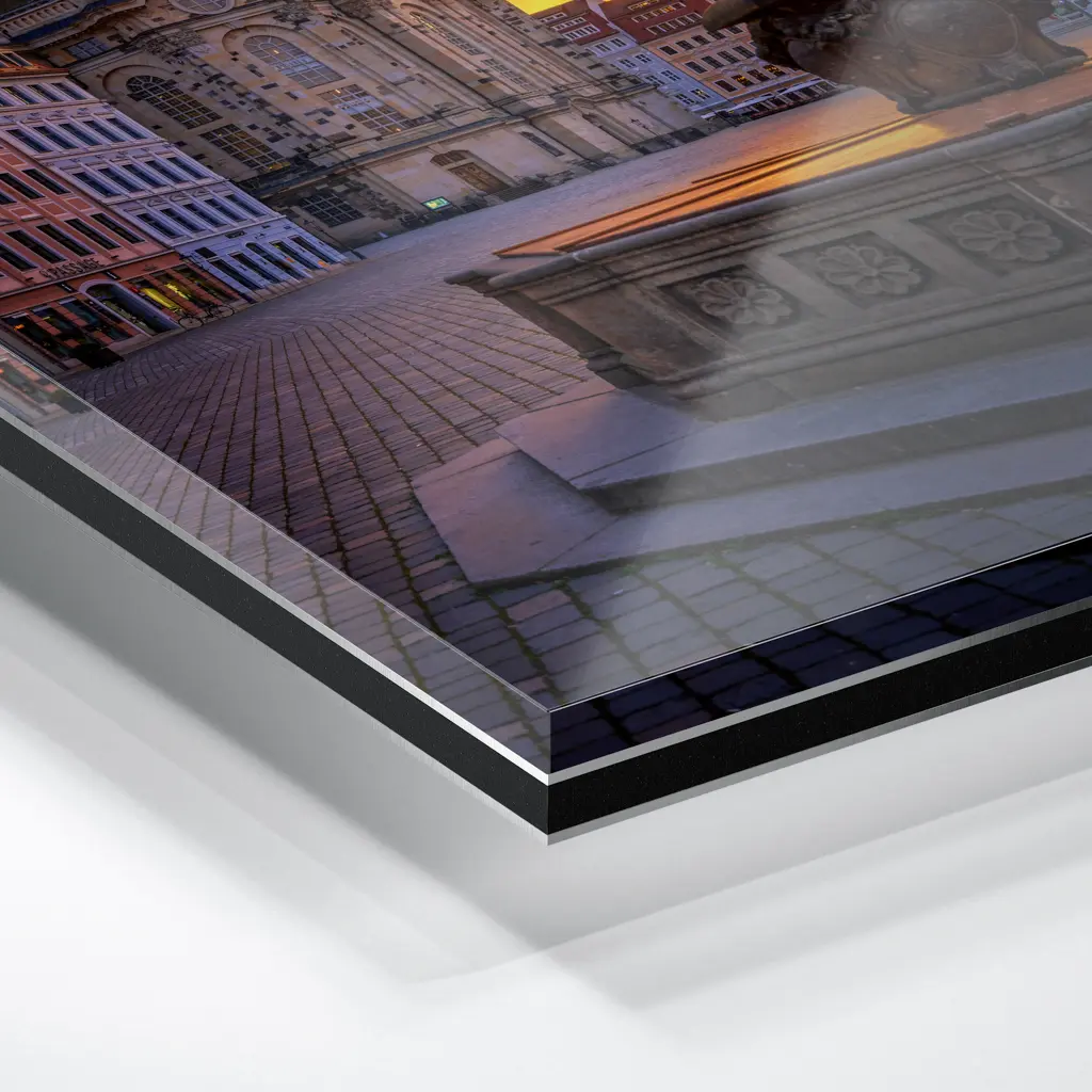 Das Foto wird im UV-Direktdruckverfahren auf eine glänzende Acrylplatte gedruckt. Die Kombination aus kristallklarem Acrylglas und den lichtechten UV-Tinten sorgt für eine langlebige und detailscharfe Wiedergabe der Bilder. Das Bild wird bei dieser Variante durch eine rückseitige 3 mm starke schwarze Forexplatte verstärkt. Es ist durch den Direktdruck und die verwendeten Materialien günstiger, wirkt aber auch sehr hochwertig.