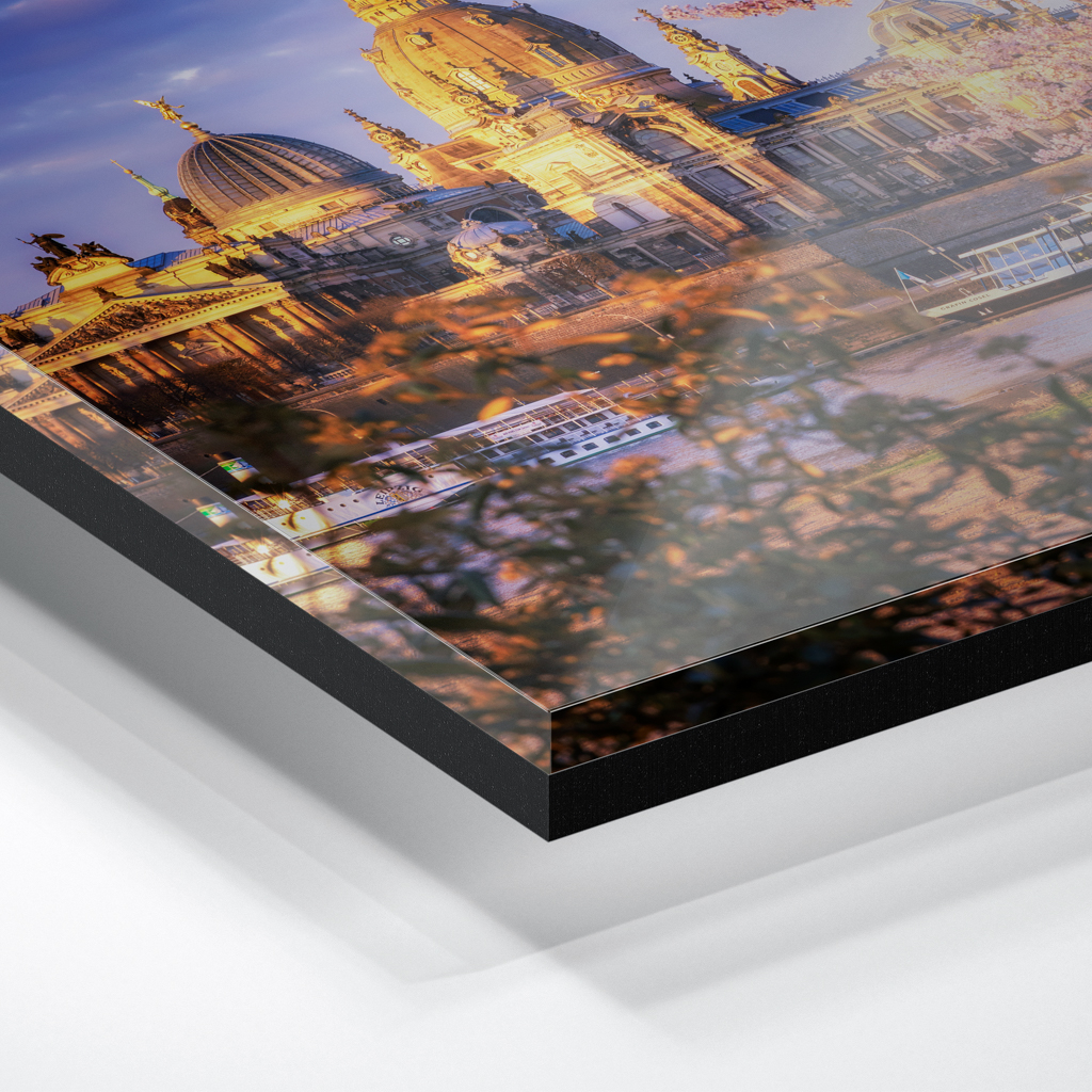 Das Foto wird im UV-Direktdruckverfahren auf eine glänzende Acrylplatte gedruckt. Die Kombination aus kristallklarem Acrylglas und den lichtechten UV-Tinten sorgt für eine langlebige und detailscharfe Wiedergabe der Bilder. Das Bild wird bei dieser Variante durch eine rückseitige 3 mm starke schwarze Forexplatte verstärkt. Es ist durch den Direktdruck und die verwendeten Materialien günstiger, wirkt aber auch sehr hochwertig.