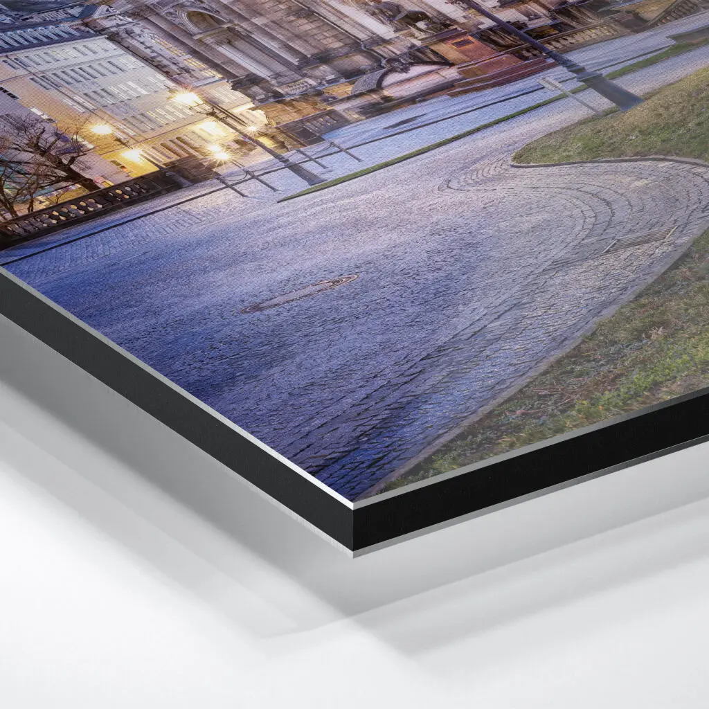 Neben den Fotopapieren die wir dir im nächsten Absatz erläutern, bieten wir dir auch einen hochwertigen UV-Direktdruck auf Alu-Dibond an. Bei einem Alu-Dibond Board handelt es sich um eine 3 mm starke, formstabile Aluminiumverbundplatte mit einem schwarzen Polyethylen-Kern, der von zwei dünnen, matt weiß lackierten Aluminiumdeckschichten umschlossen wird. Auf dieser weißen Oberfläche wir das Foto im UV-Direktdruck auf das Alu-Dibond Board gedruckt.