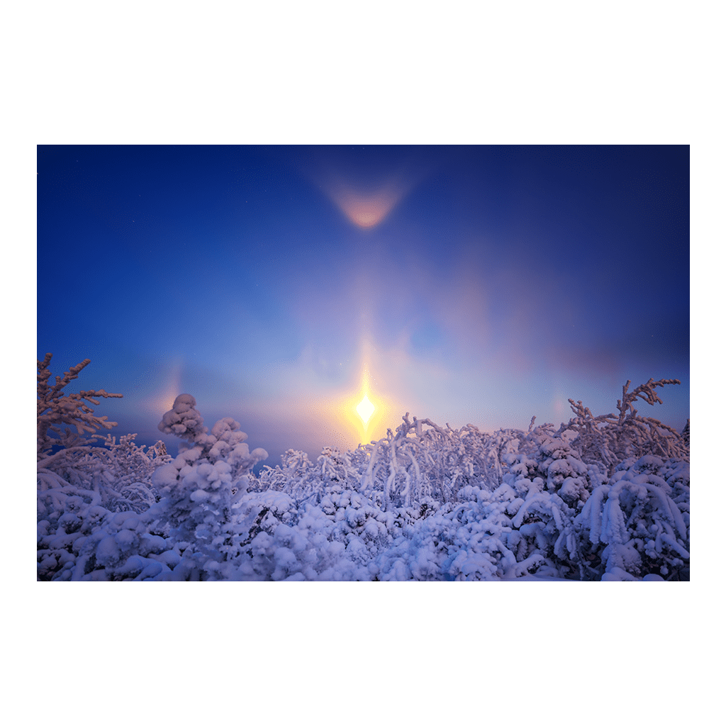 Unter diesem himmlischen Leuchtring erstreckt sich eine winterliche Märchenlandschaft: dichte, schneebedeckte Fichten und kahle Zweige sind bis in die kleinste Verästelung mit funkelndem Rauhreif und dickem Pulverschnee überzogen. Die Bäume wirken wie erstarrte Wächter, die das sanfte, diffuse Licht des Halos reflektieren und in Tausenden winziger Kristalle zurückwerfen. Im unteren Bilddrittel steigt der Horizont in zartem, warmem Apricot- und Rosaton an – das allererste, kaum wahrnehmbare Leuchten des nahenden Sonnenaufgangs kündigt sich an und schafft einen zauberhaften Kontrast zur kalten, blauen Nacht.