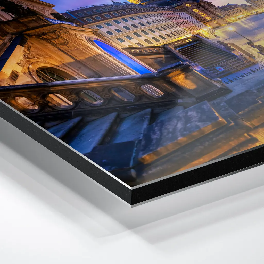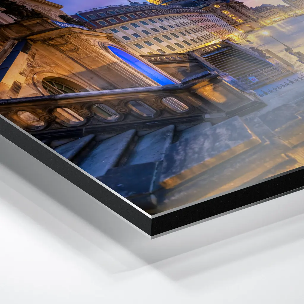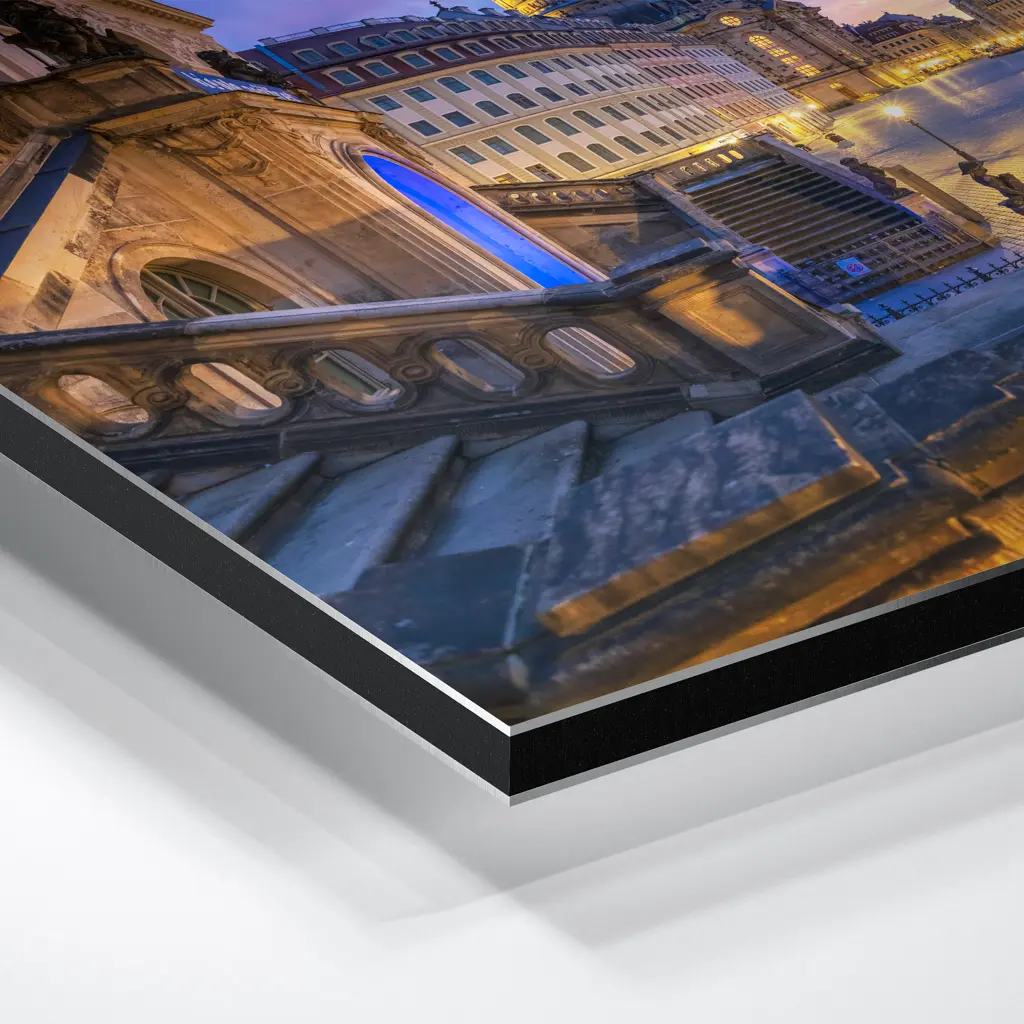 In der zarten Blauen Stunde, kurz vor dem ersten Gold des Morgens, liegt der Dresdner Neumarkt in stiller, fast überirdischer Ruhe. Von den geschwungenen Treppen des Verkehrsmuseums blickt man hinab auf das weite, leergefegte Pflaster des Platzes, das im kühlen Blauviolett des frühen Himmels sanft schimmert.