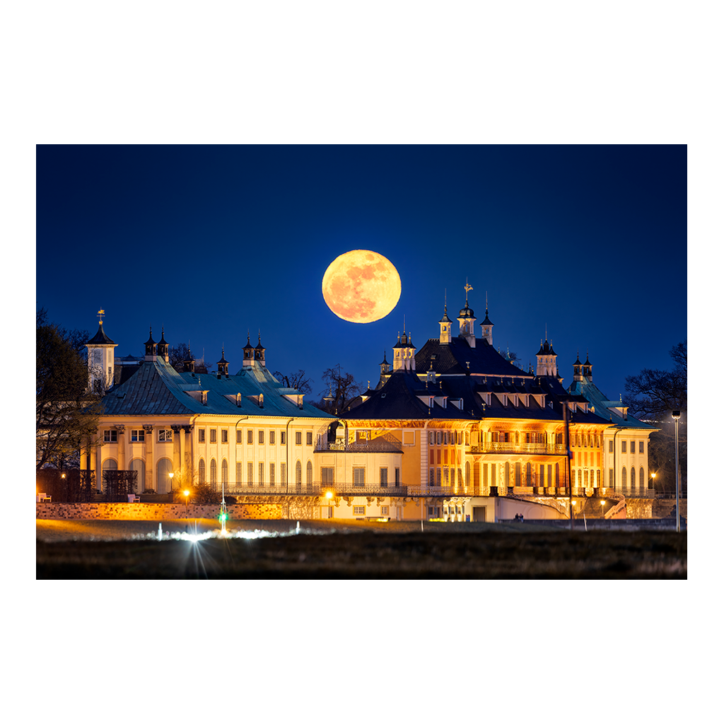 Vollmond über dem Schloss Pillnitz – ein magischer Moment, den wir am Abend des 2. April 2026 einfangen konnten. Der riesige, leuchtend orangefarbene Mond war gerade hinter dem prachtvollen Barockschloss empor gestiegen, während die warme Beleuchtung der Fassade des Schlosses Pillnitz im Vordergrund für eine märchenhafte Atmosphäre gesorgt hatte. Die Luft war kristallklar, der Himmel tiefblau – einfach perfekt.