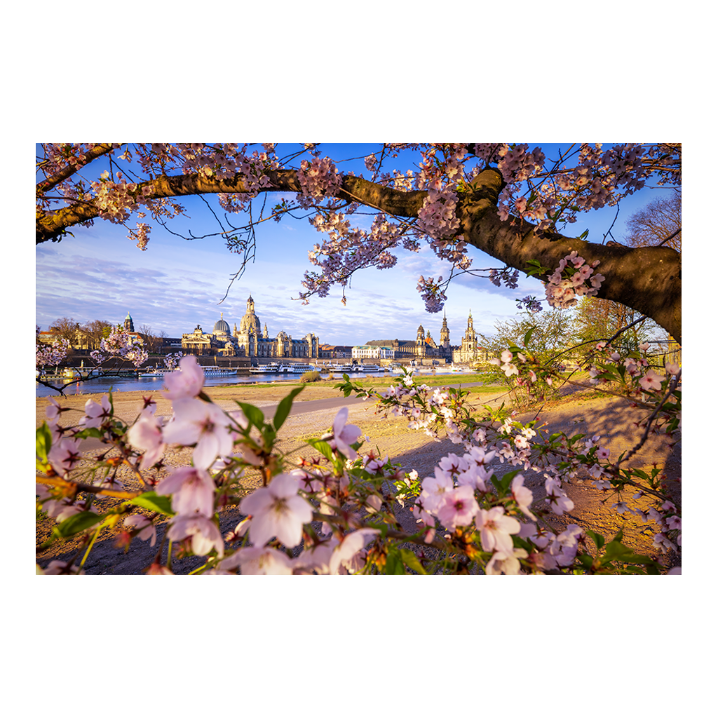 Früh am Morgen, wenn die ersten goldenen Strahlen der aufgehenden Sonne die Elbe und die barocke Skyline von Dresden sanft streicheln, öffnet sich ein zauberhafter Blick vom Königsufer aus. Im Vordergrund rahmt ein üppig blühender Kirschbaum das Bild ein – zarte rosa-weiße Blüten hängen schwer an den Ästen und lassen die Szene wie aus einem Traum wirken.