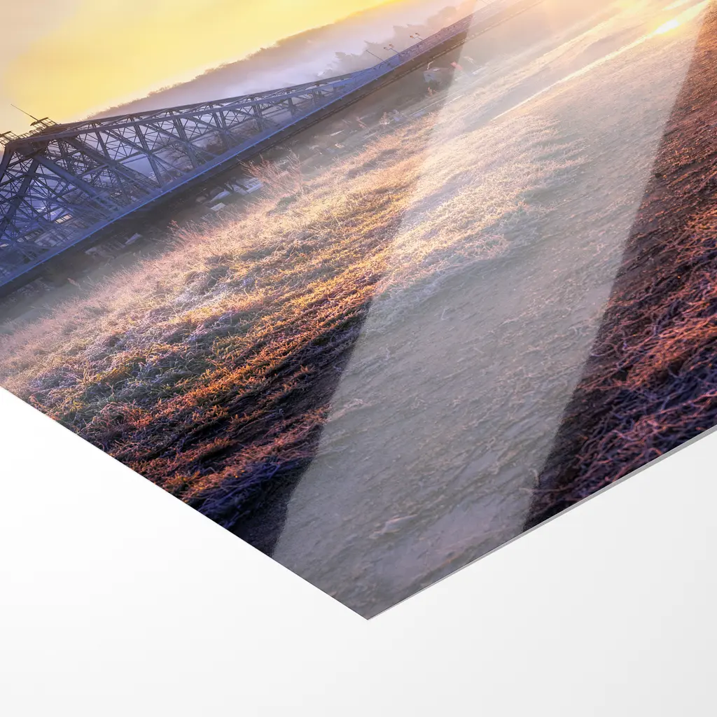 Im eisigen Griff eines herbstlichen Morgens thront das Blaue Wunder wie ein filigranes Stahlgewächs über der nebligen Elbe, während der Sonnenaufgang in goldenen Strahlen durch den Dunst bricht und den Himmel in zarte Rosa- und Violetttöne taucht. Das gefrorene Gras am Ufer glitzert wie mit Diamanten bestreut, ein schmaler Pfad windet sich hindurch, gesäumt von kahlen Bäumen, deren Äste sich wie dunkle Silhouetten gegen das Licht abzeichnen. Im Hintergrund verschwimmen die Hügel in weichem Nebel – ein Moment purer, frostiger Magie, in dem Dresdens Ingenieurskunst mit der zerbrechlichen Schönheit des Winters verschmilzt.