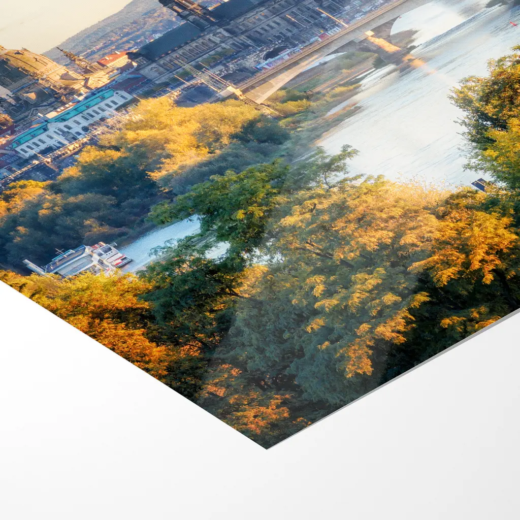 Von der Drohne aus, hoch über der Elbe, breitet sich Dresdens unvergleichliche Skyline im warmen Abendlicht aus: Die goldene Kuppel der Frauenkirche leuchtet als Herzstück, flankiert vom klassizistischen Ständehaus und der mächtigen Hofkirche. Dahinter ragen Rathausturm, Hausmannsturm und der Turm der Kreuzkirche in den zart violett-orangefarbenen Himmel. Im Vordergrund thront die elegante Semperoper, während die Marienbrücke wie ein filigranes Band die Elbe überspannt. Herbstliche Bäume in flammendem Gold säumen das Ufer – ein atemberaubendes Panorama, in dem die Elbflorenz im sanften Glanz der blauen Stunde Geschichte und Schönheit vereint.