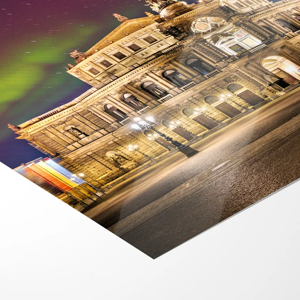 Vor der prächtigen Kulisse der Semperoper entfaltet sich ein magischer Moment: Die barocke Fassade der Oper leuchtet warm und golden im Schein der der Laternen des Theaterplatzes, während sich darüber ein tiefdunkler, mit Sternen übersäter Nachthimmel in dramatische Farben taucht. Intensive Smaragdgrün, leuchtendes Pink und zarte Violett-Töne der Polarlichter ziehen in weichen, wellenartigen Bändern und Schleiern über das Gebäude hinweg.