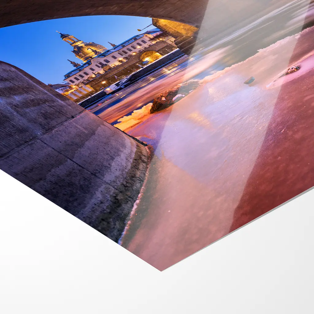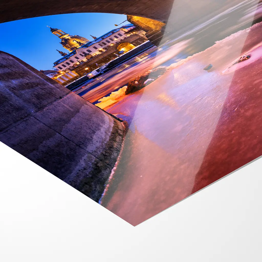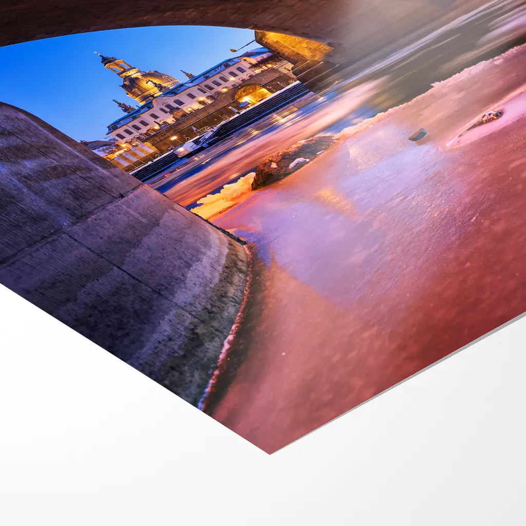 An einem kalten Winterabend in Dresden, umhüllt die Blaue Stunde die Elbe in einem zauberhaften, tiefblauen Schimmer. Im Vordergrund glitzern Eisschollen auf der halb gefrorenen Elbe, ihre Oberflächen schimmern in sanften Rosa- und Blautönen, als ob sie das letzte Licht des Tages einfangen.
