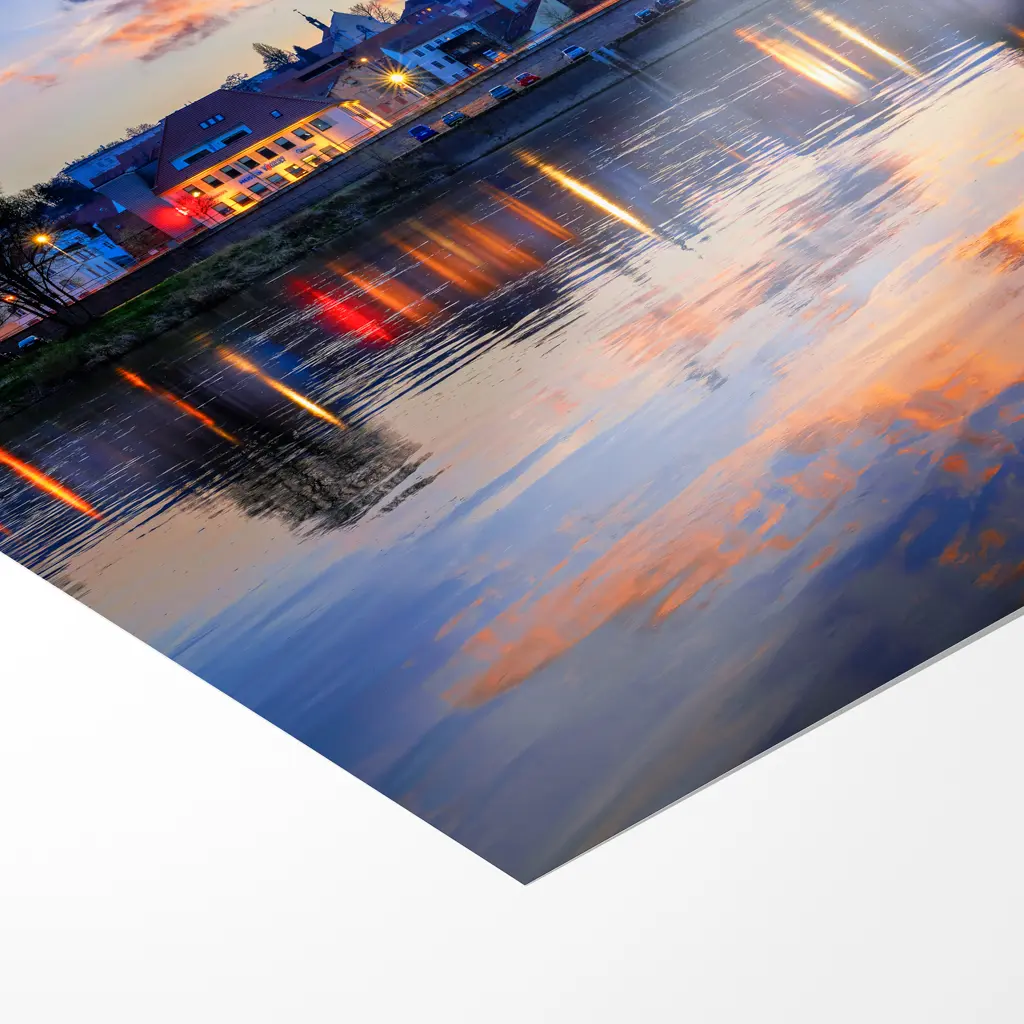 Das Bild vereint zwei magische Momente: den glühenden Sonnenuntergang mit seiner intensiven Farbpracht und die einsetzende Blaue Stunde mit ihrer tiefen, klaren Atmosphäre. Durch die geschickte Überblendung in Photoshop erscheint die Burg bereits festlich illuminiert, während der Himmel noch in der vollen Pracht des Abendrots leuchtet – ein harmonischer, fast unwirklich schöner Augenblick, der die Albrechtsburg in ihrem schönsten Licht zeigt.