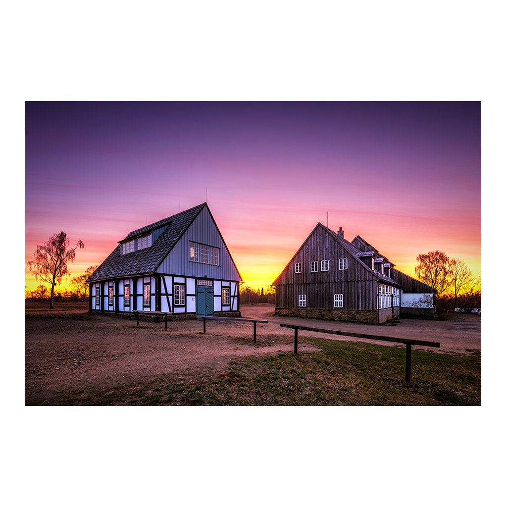 An einem kühlen Aprilmorgen, etwa 20 Minuten vor Sonnenaufgang, taucht ein intensives Morgenrot den Himmel über Freiberg in ein atemberaubendes Farbenspiel aus tiefem Violett, zartem Rosa und leuchtendem Orange. In diesem magischen Licht stehen die historischen Übertageanlagen der Alten Elisabeth – ein Kleinod des sächsischen Silberbergbaus – still und eindrucksvoll nebeneinander.