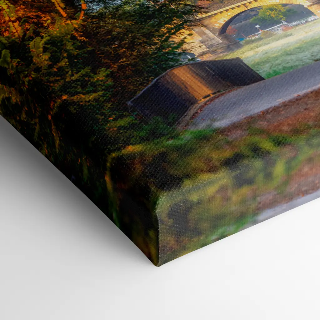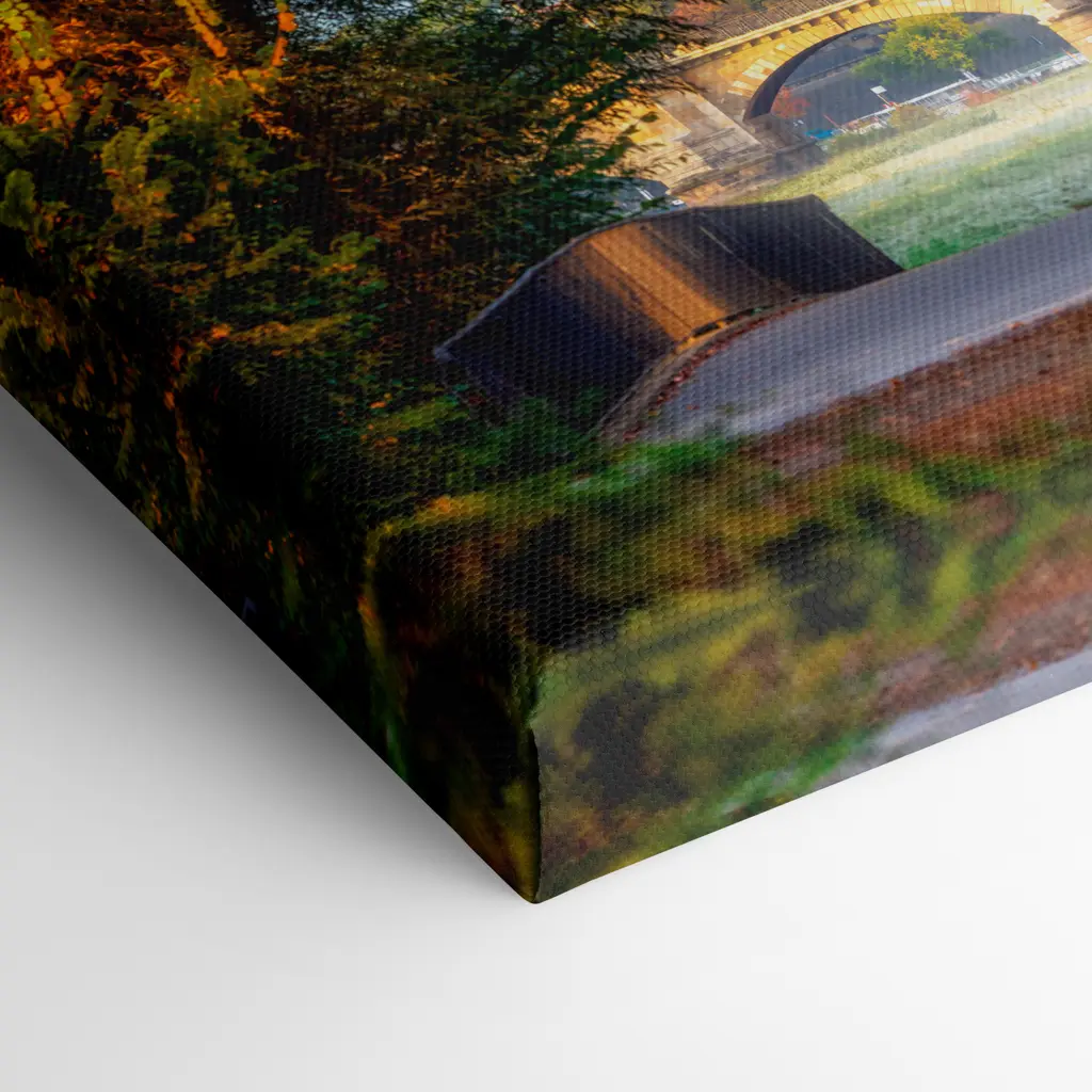 Die herbstliche Elbe liegt noch im sanften Morgennebel, als die goldene Kuppel der Frauenkirche über der Stadt erstrahlt. Im Vordergrund überspannt die elegante Albertbrücke mit ihren Sandsteinbögen den Fluss, gerahmt von leuchtend gelben Bäumen. Ein taufrischer Uferpfad, bunte Blätter im Gras – Dresden zeigt sich im warmen Oktoberlicht von seiner allerschönsten Seite.