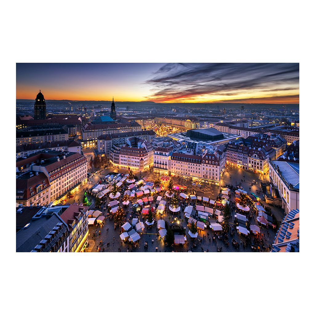 Von der Kuppel der Frauenkirche aus breitet sich an einem kalten Winterabend ein zauberhaftes Panorama Dresdens aus. Im Vordergrund leuchtet der Weihnachtsmarkt „Advent auf dem Neumarkt“ in warmem, goldenem Licht: Zahlreiche festlich dekorierte Buden mit rot-weiß gestreiften Leinendächern reihen sich eng aneinander, dazwischen funkeln Weihnachtsbäume und Lichterketten, während unzählige Besucher durch die Gassen schlendern und die vorweihnachtliche Atmosphäre genießen.