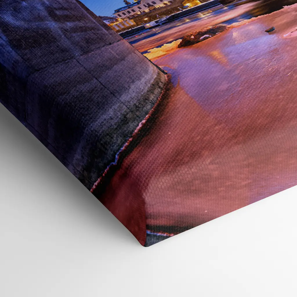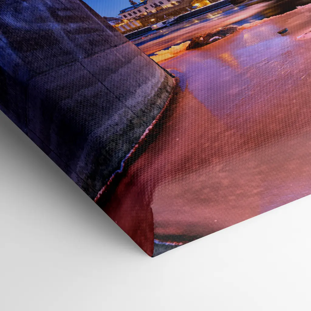 Die imposante Augustusbrücke spannt sich elegant darüber, ihr Bogen rahmt den Blick wie ein natürlicher Portal. Rechts erhebt sich die prächtige Hofkirche mit ihrem spitzen Turm, golden beleuchtet gegen den dunkler werdenden Himmel, während links die ikonische Frauenkirche mit ihrer kuppelgekrönten Silhouette thront.